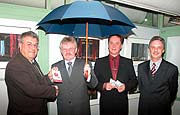 "Schirmherr" Bürgermeister Nebelo nimmt das Geld für die Flutopfer von Bocholter Karnevalisten entgegen.