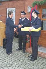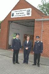 Vor dem Feuerwehrgerätehaus des IV. Zuges: Zugführer Peter Janssen, Bürgermeisterin Barbara Schlag, Stadtbrandmeister Karl Kettler