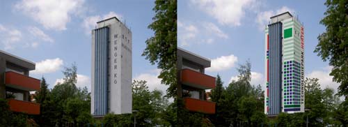 Doch bevor der beauftragte Baukünstler Robert Kaller aus Dortmund mit Pinseln, Spritzpistole und bunten Farben ans Werk geht, um den Wenger-Turm als Wegmarke im Technologiepark zu gestalten, sind bautechnische Maßnahmen zur Ausbesserung der Gebäudehülle nötig.
