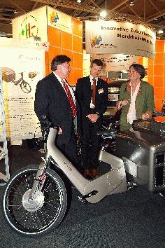 NRW-Wirtschaftsministerin Christa Thoben zeigte sich während ihres Rundgangs auf der Hannover Messe auf dem Gemeinschaftsstand der Landes-initiative Zukunftsenergien NRW beeindruckt von dem soeben fertig gestellte Cargobike, das innovative Lastenfahrrad für vielfältige inner-städtische Transportdienstleistungen, der Firma Masterflex.