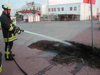 Während des Fußballspiels Deutschland - Italien am 4. Juli wurde um 21.23 Uhr das Tanklöschfahrzeug zu einem Flächenbrand in der Gewerbestraße beim TOOM-Baumarkt alarmiert. Zwischen dem Parkplatz und dem Geh-/Radweg war in einer Schicht Holzhäcksel eine kleine Brandstelle zu sehen. Das Feuer war schnell gelöscht.