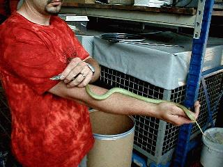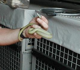 Am Donnerstag, 6. Juli, wurde im Bereich des Obelisken auf der Ravardistraße eine grüne Schlange gefangen. Hierbei handelt sich um eine argentinische Langnasen-Strauchnatter. Diese Art ist leicht giftig.