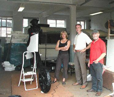Helga Kock am Brink, Stadtbaurat Ulrich Paßlick und Metallkonstrukteur Strobos in der Werkstatt der Künstlerin