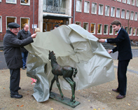 Das im Juli entwendete Fohlen ist endlich wieder „gesund“. Seit heute begrüßt es die Besucher des Rathauses und der Baumtreppe. „Der neue Standort liegt zentraler und ist von allen Seiten einsehbar. Hier ist unser Fohlen auf jeden Fall sicherer“, so Bürgermeister Dr. Uli Paetzel bei der Enthüllung der Skulptur.