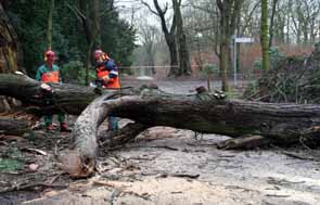 Der Orkan hat viele Bäume entwurzelt, doch nicht alle sind tatsächlich umgekippt. Viele Bäume hängen noch an anderen fest und liegen deshalb „nur“ schräg. Doch eine Windböe kann reichen, um auch diese Bäume zum Fallen zu bringen. Auch viele Äste drohen noch herabzustürzen. „Die Gefahren sind nicht immer auf den ersten Blick zu sehen, aber wird werden noch mindestens eine Woche brauchen, um die gröbsten Schäden zu beseitigen“, sagt Stefan Klümper, „deshalb bleiben die Wälder und Parks in Herten mindestens bis Sonntag komplett gesperrt.“