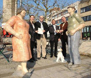 “Tanzendes Paar mit Hund” auf dem Iserlohner Marktplatz wieder komplett Das Bauunternehmen Schauerte hat dafür gesorgt, dass das Figuren-Ensemble auf dem Iserlohner Marktplatz wieder komplett ist. Die Zerstörung des Hundes vor zwei Jahren hatte Burghart und Björn Schauerte sehr betroffen gemacht, da ihnen diese Lechner-Figuren sehr gefielen. Auch in Gesprächen mit Passanten hörten sie häufig, dass der Hund als i-Tüpfelchen dieses Kunstwerkes regelrecht fehle. Daher gaben sie nach Rücksprache mit der Stadt Iserlohn die Neuanfertigung eines Hundes bei der Künstlerin Christel Lechner in Auftrag. Am Donnerstag, 15. März, schenkten Burghart und Björn Schauerte den Hund offiziell der Stadt Iserlohn und ihren Bürgerinnen und Bürgern. Im Rahmen der Iserlohner Sponsoring-Aktion "Meine Stadt. Darum geb' ich was." übergaben ihnen dafür Dr. Peter Paul Ahrens, Erster Beigeordneter und Leiter des Ressorts Planen, Bauen, Wohnen, und Nicole Behlau vom Ressort Jugend, Schule, Soziales, Senioren und Sport die Iserlohner Ehrengabe, die Ehrennadel und eine Dankurkunde des Bürgermeisters. |