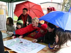 Das große Interesse der Kinder an ihrem Spielplatz wurde besonders am Freitagstermin bei strömendem Regen deutlich. Trotz dieser schlechten Wetterlage kamen viele Kinder zur Abschlussplanung. In intensiven eineinhalb Stunden erarbeiteten sie zwei konkrete Vorschläge zur Neugestaltung der Fläche.