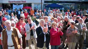 Die Veranstaltung hat sich wieder etabliert: Zur Maikundgebung am 1. Mai auf dem Marktplatz kamen hunderte Hertenerinnen und Hertener. Sie setzten sich auf der einen Seite für den Erhalt und die Sicherung von Arbeitsplätzen in Herten ein und unterstützten die Forderung der Gewerkschaft nach Mindestlöhnen, sie kamen aber auch, um bei sonnigem Wetter das Rahmenprogramm zu genießen.