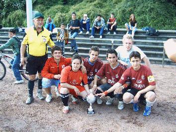 “Red Asians” sind Meister in der Iserlohner “Soccerliga 2007" Nach dem erfolgreichen Auftakt im letzten Jahr, gab es jetzt eine Neuauflage der Iserlohner “Soccerliga”. Organisiert hatten die Liga die Mitarbeiter der Jugendeinrichtungen und die Streetworker der städtischen Sozialraumteams. Insgesamt nahmen 32 Straßenmannschaften aus allen Iserlohner Stadtteilen teil. Am Freitag, 1. Juni, fand der letzte Spieltag am Hemberg statt. In vier Vorrundenturnieren hatten sich acht Mannschaften für diese Endrunde qualifiziert. Die Favoriten vom Jugendzentrum Karnacksweg scheiterten in der “Todesgruppe” B schon in der Gruppenphase und auch die Vorjahressieger aus Letmathe kamen nicht aus der Vorrunde heraus. Die diesjährige Meisterschaft zeichnete sich durch besondere Fairness der teilnehmenden Teams aus, was auch ein Verdienst der beiden hervorragenden Schiedsrichter war. Die Organisatoren danken allen freiwilligen Helfern und den Teams für diese gelungene Veranstaltung. Gruppe A Gruppe B Halbfinale Spiel um Platz 3 Endspiel |