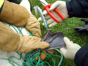 Um an das verletzte Tier zu gelangen, musste die Feuerwehr zunächst den Schwanenhahn von seiner Gefährtin trennen. Die hinzugezogene Veterinärin entfernte später den Wobbler und versorgte die Henne.