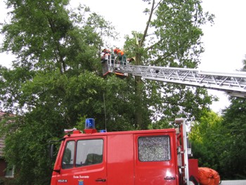 Um 16.40 Uhr wurde die Drehleiter der Feuerwehr Norden zur Unterstützung der örtlichen Wehr nach Hage gerufen, wo am Anfang der Blandorfer Straße aus einem hohen Baum große Teile abgebrochen und mit Ästen z. T. auf dem Dach eines Hauses lagen.