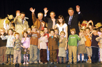 Thomas Prager, Leiter der Kreismusikschule, Dr. Paul Schrömbges, Beigeordneter der Stadt Viersen, Landrat Peter Ottmann und Prof. Dr. Leo Peters, Kultur- und Schuldezernent des Kreises Viersen (von links) stehen auf der Bühne inmitten von Kindern der Grundstufe der Kreismusikschule.