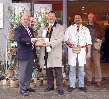 Am Dienstag, 6. November, überreichten District-Manager Ralf-Dieter Klitzka und der Iserlohner Marktleiter Marcus Klötzer die gespendeten Pflanzen an die Iserlohner Stadtbetriebe. Deren Leiter Uwe Ziemann und sein Mitarbeiter Christian Gernert freuen sich, mit den Sträuchern die neue Abpflanzung des Schulgeländes Lichte Kammer noch ansprechender gestalten zu können. |