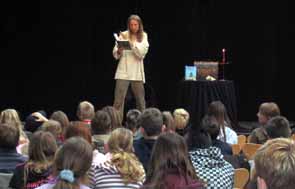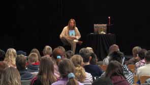Rainer Rudloff turnt über die Bühne, stolpert, springt, duckt und rollt sich mit wildem Mienenspiel zur Begeisterung des Publikums. Denn in den Zuschauerreihen sitzen die 6. Klassen der Städtischen Realschule und der Willy-Brandt-Realschule. Nach der Lesung haben die Jugendlichen noch Zeit, Fragen zu stellen und prompt schnellen die Hände in die Höhe. Sie können beruhigt sein „Herr der Diebe“ von Cornelia Funke und „Bartimäus – das Amulett von Samarkand“ von Jonathan Stroud sind in der Stadtbibliothek auszuleihen, auch DVD und Hörbuch gibt es davon. Als Sahnehäubchen zum Abschied kriecht Rainer Rudloff noch als Gollum aus J. R. R. Tolkiens „Herr der Ringe“ über die Bühne. So geht ein turbulenter Vormittag zu Ende. Unterricht einmal anders.