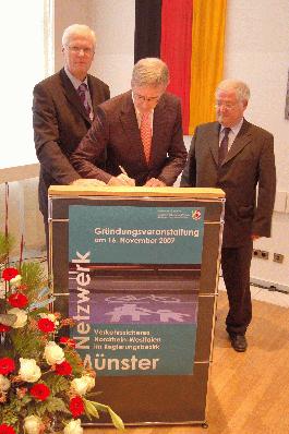 Bocholts Stadtbaurat Ulrich Paßlick unterzeichnet im Beisein von Regierungspräsident Peter Paziorek (links) die Gründungsurkunde (Foto: Bezirksregierung Münster)