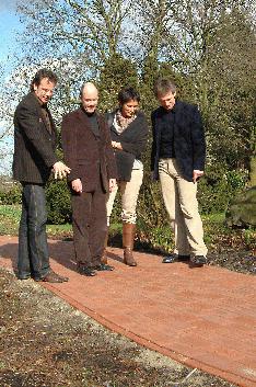 Hermann Berentelg, Geschäftsführer der ABC Klinkergruppe, Recke, stellte dem Projekt die Klinker zur Verfügung. Rund 100 Steine erhielten von den Bürgerinnen und Bürgern einen Schriftzug – mit zahlreichen weiteren konnte nun im Kreislehrgarten Steinfurt ein „Zukunftsweg“ gepflastert werden. Landrat Thomas Kubendorff begutachtete jetzt gemeinsam mit dem Kreisentwicklungsteam das Ergebnis.