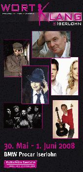 Auch in diesem Jahr hat das Kulturbüro Iserlohn hochkarätige Gäste eingeladen, die am eigens für WortKlang eingerichteten Festivalort BMW Procar Iserlohn für kurzweilige Stunden sorgen werden. Eine Künstlerin, die ihre Vielfalt unter Beweis stellt, ist Marianne Rosenberg. Sie ist am ersten Festivalabend mit einem Jazzquintett zu Gast in Iserlohn und präsentiert mit “I’m a Woman“ ihr viel gefeiertes Jazz- und Chansonprogramm (Freitag, 30. Mai, 19.00 Uhr). Anschließend zeigt die Iserlohner Band “Luxuslärm” ihr Können und beweist mit dem Programm “1000 km bis zum Meer“, dass sie zu Recht den Titel “Newcomer Band 2007 in NRW“ trägt (Freitag, 30. Mai, 22.00 Uhr). Der Vorverkauf für WortKlang 2008 hat bereits begonnen. Die Karten sind in der Stadtinformation Iserlohn, Bahnhofsplatz 2, 58644 Iserlohn, Telefon 02371/217-1819, oder während der Vorstellungen an der Kasse des Parktheaters erhältlich. Parktheater-Abonnenten bekommen zehn Prozent Ermäßigung auf die Tickets. Weitere Vorverkaufsstellen sowie ausführliche Informationen zum Festival finden alle Interessierten auch auf der Internetseite www.wortklang.iserlohn.de