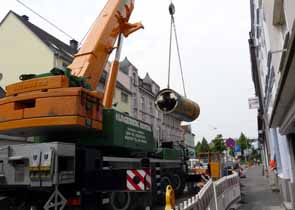 Das Hauptkanalrohr in der Ewaldstraße ist fertig verlegt. Zum Abschluss gab es für die Anwohner Ende letzter Woche noch einmal Spannendes zu beobachten. Ein großer Autokran stand in der Ewaldstraße, um das Maschinenrohr der Vortriebsanlage wieder an die Oberfläche zu befördern. Nach 170 Metern kam es zielgenau mit einer Genauigkeit im zwei-Zentimeter-Bereich in der in der Baugrube vor Haus Nummer 59 an.