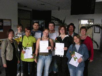 Zeugnisse für erfolgreiche Hauptschulabschlüsse bei der VHS Iserlohn Die Leiterin der Volkshochschule Iserlohn, Lieselotte Berthold, überreichte am 17. Juni elf Teilnehmern und Teilnehmerinnen die Zeugnisse zum Hauptschulabschluss. Seit dem 3. September 2007 hatten sie in einem Abendlehrgang darauf hingearbeitet. Von den sieben Schülerinnen und vier Schülern im Alter von 18 bis 45 Jahren wollen fünf weitermachen und den nächsten Lehrgang zum Erreichen des Realschulabschlusses belegen. Über das bestes Zeugnis mit einem Notenschnitt von “sehr gut” freute sich Tanja Golla. Folgende Schülerinnen und Schüler bestanden ihren Abschluss: Manuela Sofia Deiana, Nicole Dobrowolski, Tanja Golla, Niklas Hülsmann, Viktor Jabs, Tanja Karatzopoulos, Kyra Lignau, Michael Piotrowski, Marcel Schmidt und Anna Specht. |