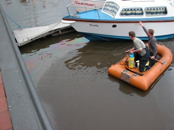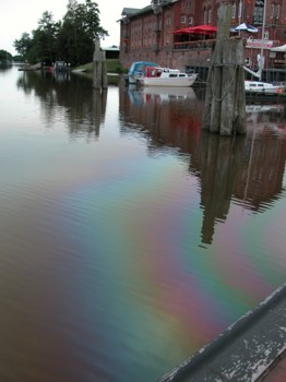 Vom Schiffsanleger auf der Ostseite des Hafens zog sich eine bunt schillernde Spur bis in Höhe des Zollhauses. Mit einem speziellen Sprühmittel zur Beseitigung von Öl auf Gewässern wurde die Verunreinigung vom Schlauchboot der Feuerwehr aus weitgehend beseitigt.