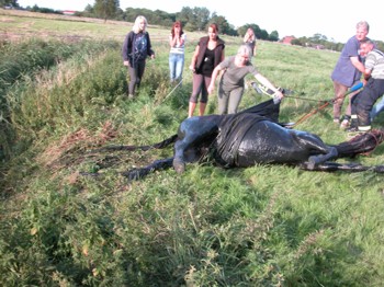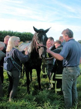 Unter Anleitung eines herbeigerufenen Tierarztes und mit Seilen und unter dem Pferd durchgezogenem Bergetuch der Drehleiter wurde das Tier mit vereinten Kräften wieder aus dem Graben gezogen und konnte nach einer kurzen Erholungspause wieder den Kopf heben und bald darauf offensichtlich unverletzt wieder auf den Beinen stehen.