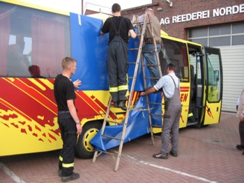 Der Rettungsdienst benötigte Hilfe. In einem Reisebus auf der Norddeicher Mole war eine Frau zusammengebrochen. Der Bus hatte nur einen Einstieg an der Vorderseite und die im Mittelteil des Busses sitzende schwergewichtige Frau konnte nicht zum Rettungswagen gebracht werden. Um den Transport durch ein Seitenfenster zu ermöglichen, musste die Scheibe entfernt und ein Tisch abgebaut werden.