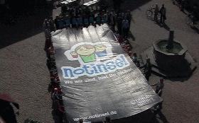 30 Grundschulkindern füllten die Feier mit Leben, indem sie gemeinsam ein Lied vortrugen und damit sehr zum gelungenen Auftakt beitrugen. Gemeinsam mit den Kindern entfalteten alle Beteiligten ein großes Megaplakat mit dem Notinsel-Zeichen.