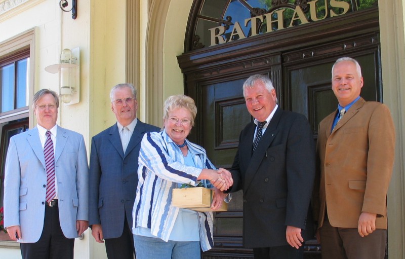 Verabschiedung vor dem Rathaus: Harald Rüdig, Reinhard Schmidt, Johanne Carow, Remmer Hedemann, Jan-Berndt Swyter (von links)