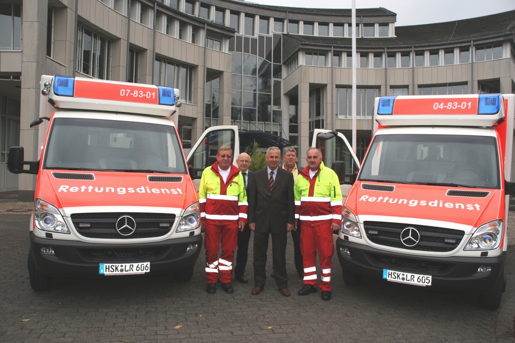 Landrat Dr. Karl Schneider stellte in den Herbstferien zwei neue Rettungswagen (RTW) in Dienst, die in den Rettungswachen Bad Fredeburg und Olsberg die Altfahrzeuge ersetzen. Die RTW auf der Basis des Mercedes-Benz Sprinters sind mit einem 184-PS-starken Turbo-Diesel mit Partikelfilter ausgerüstet. Die Hinterachse ist luftgefedert. Beide RTW wurden mit einem Aufbau der Firma Fahrtec Systeme ausgerüstet. Der Aufbau hat ein Aluminium-Gerippe mit einer Wandstärke von 40 Millimetern und verfügt über neuartige LED-Blitzer im Alkoven. Mitarbeiter der Rettungswachen haben die RTW selbst mit den reflektierenden Folien beklebt. Jedes Fahrzeug kostet ohne das medizinisch-technische Gerät rund 125.000 Euro.