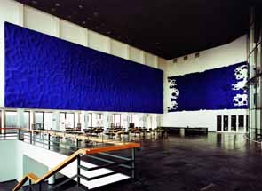 Yves Klein gilt als Avantgarde-Künstler und Vorläufer der Pop-Art. Bekannt ist er vor allem durch seine monochromen Bildkompositionen, die er in einem von ihm patentierten Ultramarinblau anfertigte. Seine größten und bedeutendsten Arbeiten schuf Yves Klein im Neubau des Musiktheaters im Revier Gelsenkirchen (1957-1959). Er entwickelte dafür große wandhohe blaue Reliefs, die teilweise mit Naturschwämmen besetzt wurden.