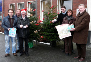 Die ersten Plätzchen sind gebacken und Kinder schreiben eifrig Wunschzettel. Jetzt sorgt auch die Innenstadtgemeinschaft „Lebendiges Herten“ für weihnachtliche Vorfreude. Mit 100 geschmückten Tannenbäumen haben sie „Herten verzaubert“. Zwei der mannshohen Bäume stehen nun vor der Eingangspforte des Rathauses. Bürgermeister Dr. Uli Paetzel nahm, als Schirmherr der Aktion, die Nordmanntannen entgegen: „Ich freue mich sehr, dass nun viele Weihnachtsbäume die Innenstadt verschönern!“