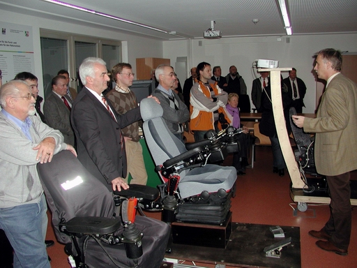 Thilo Wagner (r.) erläutert den Ausschussmitgliedern die Simulationsarbeitsplätze im Bildungszentrum, von denen aus z.B. ein Holzvollernter (Harvester) gesteuert werden kann. / Foto: Pressestelle HSK
