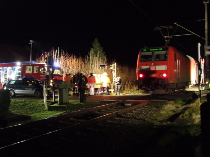 Am Freitagabend wurde die Freiwillige Feuerwehr Norden gegen 21.55 Uhr gemeinsam mit den Feuerwehren Upgant-Schott und Osteel zu einem Unfall auf der Bahnstrecke Norddeich Mole - Emden gerufen. Direkt auf dem Bahnübergang am Wirdeweg in Osteel war eine Person vom Zug erfasst und getötet worden. Die Feuerwehr Norden sollte ursprünglich die Erdung der Oberleitung vornehmen, dies war jedoch nicht erforderlich. Nach etwa einer Stunde konnten der Rüstwagen und dein Löschgruppenfahrzeug mit dem Anhänger "Bahnrettung" die Einsatzstelle wieder verlassen.