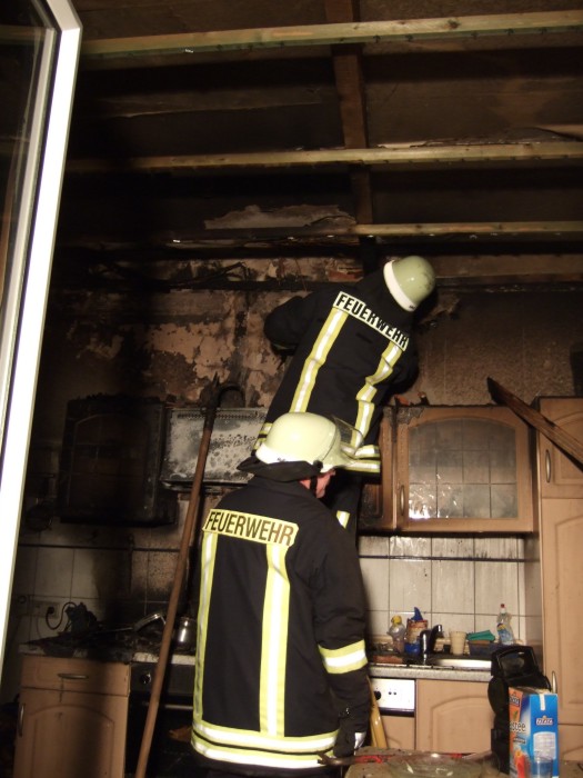 Feuerwehrleute entfernen die Holzdecke und legen die Holzbalken frei, in denen sich noch Glut befand.