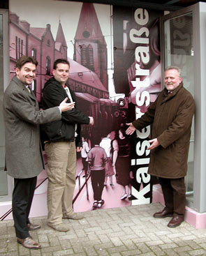 Die Dortmunder Agentur hat die Aufgänge im Auftrag der Hertener Stadtwerke neu gestaltet. Jetzt bieten die ehemals weißen Flächen Einblicke in die Vergangenheit der Stadt. Am Durchgang zur Familienbildungsstätte zeigt sich die alte Kaiserstraße mit dem Eden-Filmtheater und der Antoniuskirche in violett. Eine andere Perspektive der Kaiserstraße zeigt der Aufgang an der Brinkertgasse: Hier schmücken das Antoniusdenkmal und das Hotel Baumeister in grün die Außenwände. Die Ansichten auf die Drogerie Büttner und das Kaufhaus Wälter präsentieren sich am Aufgang Stuckengasse in orange. Und das öffentliche Toilettenhäuschen ist ganz in blau gestaltet mit historischen Bildern aus der Marktstraße und dem Pastoratsweg.