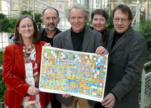 Als Zeichen der Anerkennung konnte VHS-Leiter Frank Senner gemeinsam mit den Studienleitern Christina Zyprian, Manfred Nousch und Willi Brozio den Kunstdruck des aktuellen Netzwerkbildes von Prof. Dr. Vomberg entgegennehmen. Der Druck wird seinen Platz im Foyer des VHS-Hauses bekommen.