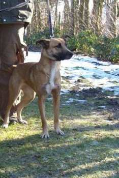 Wendy ist eine circa kniehohe Mischlingshündin mit einem kurzen, hellen Fell - nur ihre Schnauze hat eine dunkle Zeichnung. Die Hündin ist sehr aktiv und verspielt. Wendy ist für den Hundesport geeignet, wie zum Beispiel Agility.