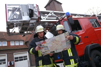 Die Feuerwehrmänner Jörg Meier und Stefan Kleen (von links) studieren einen Stadtplan, im Vorfeld muss klar sein wo es lang geht, im Einsatz bleibt dafür kaum Zeit.