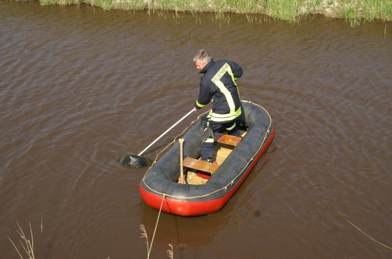 Die Norder Polizei entdecke während einer Streifenfahrt durch den Neuseedeicher Weg im Norder Ortsteil Westermarsch II einen Autoreifen der aus einem Zuggraben ragte. Da der Verdacht bestand, dass eventuell ein ganzer PKW in dem Graben lag, wurde die Freiwillige Feuerwehr Norden hinzu gerufen. Zum Einsatz kam das Schlauchboot des Rüstwagens mit dem ein Feuerwehrmann sich dem Rad näherte und dann feststellte das es sich nur um ein einzelnen Reifen handelte. Mit der Bergung des Reifens war der Einsatz beendet.