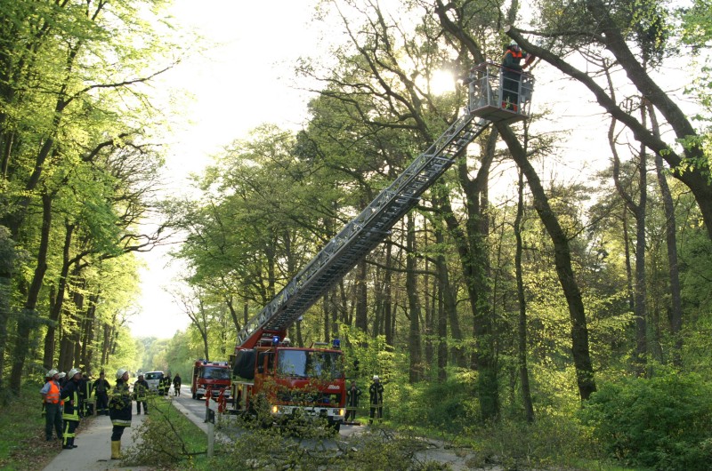 Zu einem gemeinsamen Einsatz rückten die Freiwillige Feuerwehr Norden sowie die Ortswehr Hage am Sonnabendnachmittag aus. Auf der Blandorfer Straße in Berumbur war ein morscher Ast aus einer Baumkrone gebrochen und auf die Straße gefallen. Hierdurch kam es zu einem Unfall bei dem ein Fahrzeug beschädigt wurde. Bei der Unfallaufnahme durch die Polizei wurde festgestellt, dass aus der Krone noch weitere Äste drohten abzustürzen. Die Feuerwehr Hage und die Polizei mussten für die Schneidarbeiten die Blandorfer Straße für etwa eine halbe Stunde voll sperren. Von der Norder Drehleiter aus, wurden die Äste mit einer Kettensäge entfernt.