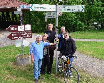 Regionales RADFORUM startet mit neuen Schildern Region Kassel. Wo ein Weg ist, ist auch eine Beschilderung. Was logisch klingt und für den Autoverkehr auch meist Standard ist, trifft im Radverkehrsbereich nicht immer zu. Auf manchen Radwegen ist die Beschilderung mangelhaft: entweder fehlt sie an Abzweigungen, oder sie ist zu klein, oft sind es unterschiedliche Schildertypen mit verschiedenen Farben, manchmal stehen sie falsch oder sind durch Äste verdeckt oder gar verdreckt. Diesem Schilder-Salat sind keine Grenzen gesetzt und trägt mancherorts erfolgreich zur Verwirrung und natürlich zum Ärger der Radfahrer bei. „Dieses Schilder-Sammelsurium wird in Stadt und Landkreis Kassel bald der Vergangenheit angehören“, informiert der Leiter des Straßenverkehrsamtes der Stadt Kassel Gunnar Polzin. Das neue RADFORUM REGION KASSEL habe das Problem erkannt. „Bis Ende 2010 wird die neuen Radverkehrswegweisung nach bundeseinheitlichem Standard in der Stadt und im Landkreis Kassel Realität sein“, kündigt Polzin an. Im Zuge der Neubeschilderung kommen nur noch drei Schildertypen zur Anwendung: Tabellenwegweiser, Pfeilwegweiser und Zwischenwegweiser. „Die Inhalte dieser Wegweisung bestehen aus Hauptziel, Unterziel, Entfernungsangabe, Routenpiktogramm, Zielpiktogramm. Streckenpiktogramm und Zusatzplaketten mit grafischen Symbolen“, erläutert der Radverkehrsbeauftragte der Stadt Kassel Gerhard Späth. Die Hauptziele dienen dabei der großräumigen Orientierung und werden auch über Stadt- und Kreisgrenze ausgeschildert, da Radler „natürlich an der Orts- oder Kreisgrenze nicht Halt machen“. „Außerdem können in die Wegweisung Übergangsstellen zu anderen Verkehrsmitteln wie Bus und Bahn sowie zusätzliche Infos zu Entfernung, Streckenbeschaffenheit und touristische Einrichtungen wie Bett & Bike-Betriebe mit eingebunden werden“, ergänzt Rudi Roy, Radverkehrsbeauftragter des Landkreises Kassel. Durch konkrete Vorgaben für die Wegweisung werde damit ein einheitliches Erscheinungsbild, ein hoher Qualitätsstandard und eine gute Erkennbarkeit für den Nutzer erreicht. Die neue Beschilderung besteht aus zwei Systemkomponenten: der direkten zielorientierten Wegweisung für Alltagsradler und der routenorientierten Wegweisung für Fahrradtouristen. Themenrouten und Routenbezeichnungen können an den Schildern durch Routenlogos auf Zusatzplaketten in ein zielorientiertes Grundnetz der Fahrradwegweisung integriert werden. Damit werden gleichzeitig die Orte, die Fernradwege und die Sehenswürdigkeiten übersichtlich miteinander vernetzt. Mit dieser Wegweisung sollen zukünftig alle nordhessischen Städte und touristisch relevanten Orte übersichtlich miteinander verbunden werden. Die vorbereitende Planung für die neue Radverkehrswegweisung ist nun abgeschlossen und der Austausch, beziehungsweise die Neu-Beschilderung wird in diesem Sommer beginnen, kündigt Polzin an. Da allein auf dem Gebiet der Stadt Kassel etwa 2.200 Schilder-Standorte vorgesehen sind, werde für die Neubeschilderung im Stadtgebiet mit einem Zeitraum von etwa einem Jahr gerechnet. Die Gesamtkosten dieser Maßnahme belaufen sich auf rund 250.000 Euro. Die Radverkehrswegweisung wird aus Mitteln des Hessischen Verkehrsministeriums in einer Höhe von 75 – 80 % gefördert. Das seit 1. Januar 2009 bestehende RADFORUM REGION KASSEL tritt mit der neuen Beschilderung erstmalig nach außen und setzt damit ein sichtbares Zeichen für eine umfassende Radverkehrsentwicklung in dieser Region. „Am Radforum sind alle 30 Kommunen und radverkehrsrelevanten Behörden und Verbände der Kasseler Region beteiligt“, informiert Susanne Selbert, Fachbereichsleiterin Beteiligung und Verkehr beim Landkreis Kassel. Die Aufgaben des neuen Gremiums seien beachtlich. Neben der Beschilderung stehen auch die Entwicklung eines regionalen Radroutennetzes für den Alltags- und Freizeitradverkehr auf der Agenda. Selbert: „Die Verbesserung der bestehenden und der Bau weiterer Radverkehrsanlagen und Radwege in Stadt und Kreis Kassel sollen ebenso verwirklicht werden wie die Lückenschlüsse der touristischen Radrouten“. Auch die bessere Verknüpfung zwischen Radverkehr und öffentlichem Nahverkehr werde mit vielen weiteren Themen vom neuen Radforum in Angriff genommen. „Unser Ziel ist die Verdoppelung des Radverkehrsanteils am Gesamtverkehr in Stadt und Kreis“ sind sich Polzin und Selbert einig. Mit diesen zahlreichen Aktivitäten greift das RADFORUM REGION KASSEL die veränderten Mobilitätsbedürfnisse zu mehr Radverkehr in der Bevölkerung auf und setzt damit deutliche Zeichen für eine umweltfreundliche Verkehrsplanung und das neue Bewusstsein für die Aufteilung des vorhandenen Verkehrsraumes. Die Mobilitätsentwicklung der Kasseler Region erfährt damit eine neue und zukunftsfähige Dimension. Ansprechpartner RADFORUM REGION KASSEL: Gerhard Späth, Stadt Kassel, Tel.: 0561 87-6227 Rudi Roy; Kreis Kassel, Tel.: 0561 1003-1135 Michael Heß, Zweckverband Raum Kassel, Tel.: 0561 10970-33 Pressekontakt: Pressestelle LANDKREIS KASSEL, Harald Kühlborn Zu dieser Meldung können wir Ihnen folgendes Medium anbieten: Radforum Beschilderung Auf dem Foto sieht man von links nach rechts Rudi Roy (Radfahrbeauftragter des Landkreises Kassel), Susanne Selbert (Fachbereichsleiterin Beteiligungen und Verkehr Landkreis Kassel), Gunnar Polzin (Leiter Straßenverkehrsamt Stadt Kassel), Michael Heß (Zweckverband Raum Kassel) und Gerhard Späth (Radbeauftragter der Stadt Kassel).