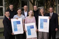 Landrat Peter Ottmann (rechts) und Ludger Gooßens, Vorstandsvorsitzender und Stiftungsvorstand der Sparkasse Krefeld (links) mit den Preisträgern des Kunstpreises 2009 Ulrike Anna Bleier, Marie Therese Martin und Oleg Zhukov (von rechts) sowie der Jury mit dem Viersener Schriftsteller Markus Orths, FAZ-Redakteur Jochen Hieber und Wolfgang Schiffer, Leiter der Programmgruppe Hörspiel und Feature von WDR 3 (hintere Reihe von links).