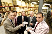 Mehr als 4.000 Artikel sind im Lager der WKK GmbH in Nettetal vorrätig: Geschäftsführer Bram Boers (rechts) und Edward Willems (2. von links) zeigen Rolf Adolphs, Geschäftsführer der Wirtschaftsförderungsgesellschaft für den Kreis Viersen, Landrat Peter Ottmann und Nettetals Bürgermeister Christian Wagner (von rechts) die verschiedenen Artikel.