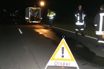 Die Freiwillige Feuerwehr Norden musste in der Nacht zum 15.06.2009 gegen 23.35 Uhr zu einer Ölspur auf der Norddeicher Straße ausrücken. In Höhe des Landhauses Rinke war bei einem PKW während der Fahrt der Motor geplatzt. Durch den Schaden wurde die Bundesstraße auf einer Länge von etwa 150 Meter verunreinigt. Gemeinsam mit der Polizei wurde die Gefahrenstelle abgesichert, die Feuerwehr band die gröbste Verschmutzung mit Bindemittel ab. Gegen 1.30 Uhr konnte die Feuerwehr abrücken, eine Fachfirma übernahm die restliche Reinigung der Fahrbahn.