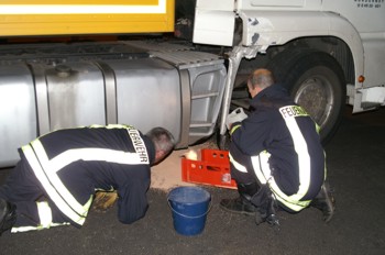 Zu einer Hilfeleistung wurde am 18.06.2009 um 3.51 Uhr die Ölschadensgruppe der Freiwilligen Feuerwehr Norden alarmiert. Im Osthafen hatte sich die Zugmaschine eines Sattelzuges beim Rangieren an einer Laterne den Dieseltank beschädigt. Mitarbeiter der Spedition hatten bereits einen Auffangbehälter unter den beschädigten Tank gestellt, so dass nur eine geringe Menge Diesel auf die Straße lief. Die Arbeit der Feuerwehr beschränkte sich daher auf das Abstreuen des ausgelaufenen Kraftstoffes und die Sicherstellung des Brandschutzes. Der Inhalt des Tanks wurde dann in Dieselfässer umgepumpt. Nach ca. 1 ½ Stunden war der Einsatz für die Feuerwehr, die mit einem Löschgruppenfahrzeug und zehn Einsatzkräften ausgerückt war, beendet. Vor Ort war auch eine Streifenwagenbesatzung der Polizei Norden.