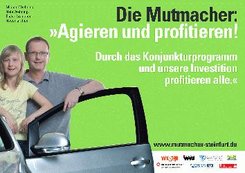 So oder so ähnlich sind in diesem Jahr viele Menschen an ein neues Auto oder an einen Jahreswagen gekommen. Sparen bietet eben Möglichkeiten für Investitionen. Das meint auch Familienvater Michael Wehning. Er und seine Tochter Nele sind zurzeit auf einem von sieben großen Plakaten abgebildet, die im gesamten Kreis Steinfurt insgesamt an 113 Plätzen zu sehen sind. Denn die beiden sind „Mutmacher“. Zehn Menschen verkünden auf den Plakaten ihre persönliche Strategie gegen die Krise. Die Kampagne wurde initiiert von der Wirtschaftsförderungs- und Entwicklungsgesellschaft des Kreises Steinfurt (WESt), der Wirtschaftsvereinigung Steinfurt, der Kreishandwerkerschaft Steinfurt-Warendorf, der IHK Nord Westfalen, der Bundesagentur für Arbeit, der GAB sowie der Volksbanken und Sparkassen im Kreis.