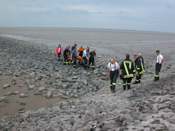 Am 29.07.2009 gegen 13.15 Uhr wurde die Freiwillige Feuerwehr Norden zu einer Personenrettung nach Norddeich gerufen. Im Hafenbereich war eine Person auf einem Wellenbrecher gestürzt und hatte sich eine Verletzung zugezogen. Mit Hilfe mehrerer Einsatzkräfte konnte die Person auf einer Schleifkorbtrage wieder ans Festland befördert und dem Rettungsdienst übergeben werden. Die Feuerwehr war mit dem Rüstwagen, zwei Löschgruppenfahrzeugen und dem Mehrzweckboot vor Ort. Ebenfalls im Einsatz waren die Polizei und der Rettungsdienst mit einem Rettungswagen. Nach ca. einer Stunde war der Einsatz für die Feuerwehr beendet.
