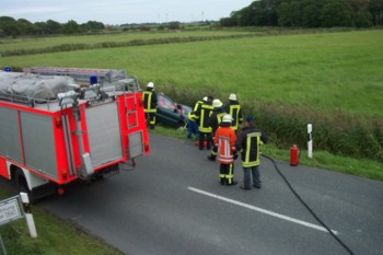 Heute gegen 15.00 Uhr wurde die Freiwillige Feuerwehr Norden zu einem Verkehrsunfall mit eingeklemmter Person gerufen. Im Ortsteil Ostermarsch waren auf der Landstrasse in Höhe Dieksweg zwei PKW kollidiert. Einer der beiden PKW kam in einem Seitengraben zum stehen. Die darin befindliche verletzte Person konnte sich aus eigener Kraft nicht befreien. Die Feuerwehr musste mit dem Hilfeleistungssatz des Rüstwagens die Person retten. Sie wurde daraufhin dem Rettungsdienst übergeben.