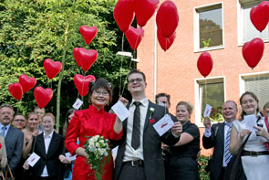 „60 Hochzeiten haben wir heute insgesamt im Kreis“, weiß der Standesbeamte Rainer Paesler. Gemeinsam mit seinen Kollegen traut er abwechselnd die Heiratswilligen. Als besondere Überraschung wartet Bezirksschornsteinfegermeister Guido Schlering vor dem Standesamt, um den frisch Vermählten viel Glück zu wünschen. Und während sich die Brautpaare die Klinke in die Hand geben, bereiten Freunde und Familie vor dem Hertener Rathaus viele Überraschungen. Bei so viel Freude macht es nichts, wenn die roten Herzluftballons die Glückwunschkarten erst beim zweiten Versuch in die Lüfte heben.