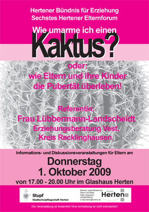 Mit Kindern in der Pubertät ist es manchmal wie mit einem Kaktus: Man zieht sie liebevoll auf und gibt ihnen alles Wichtige zum Gedeihen. Doch je größer sie werden, umso stachliger werden sie auch. Das Motto des 6. Hertener Elternforums im Glashaus am Donnerstag, 1. Oktober, ab 17 Uhr lautet darum: „Wie umarme ich einen Kaktus“ oder „Wie Eltern und Kinder die Pubertät überleben“. Bei einem Vortrag und in Workshops können sich nicht nur geplagte Eltern über das Thema informieren und diskutieren.